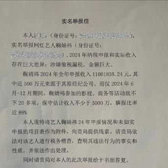 举报人直接甩了明细锤:鞠婧祎2024年全年申报的收入才1100万出头,结果光2024年下半年6-12月,她接的影视、商务活动就不下20项,保守估计收入都超5000万!算下来瞒报比例将近88%?